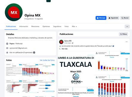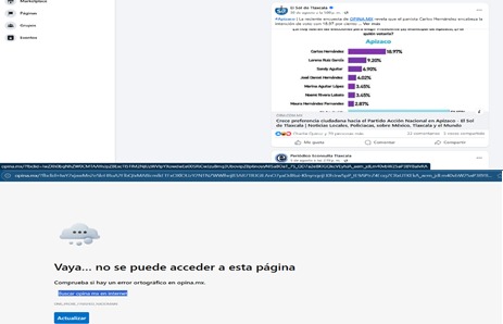 Todo empezó con una encuesta de preferencia electorales para el municipio de Apizaco, que publicó Opina.MX, o al menos que los medios que dieron cuenta de ello, así lo establecieron, porque no esta usted para saberlo, pero de todas formas se lo cuento, esta empresa, tiene como medio de información una pagina de Facebook, la cual tiene como última publicación, el 5 de mayo, porque la liga que agregaron los diferentes medios en su nota referente a esta encuesta, no lleva ningún sitio, aquí abajo les dejo imágenes que así lo corroboran. En las que podrán ver la fecha de la última publicación en una de las imágenes; mientras que la otra destaca como el link que te lleva a la supuesta encuesta, en realidad note lleva a ningún lado.