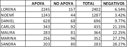 Por otro lado, interesante también, resulta el análisis de los porcentajes de negativos. Donde se aprecia que el saldo a favor de los 3 primeros lugares, es por demás notable., dado que sus negativos en este sondeo, es menor al 10%, e incluso del de Noemi Rivera, es por debajo de los 5 puntos porcentuales. No así, para los 4 restantes, pues están arriba del 20% en sus negativos, siendo las aspirantes del PRI y del PT, las que superan el 25% porcentual de rechazo.