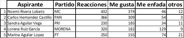 Bueno, aunque no deja de ser importante, porque da la pauta a conjeturar de donde viene tal información, si el link n da acceso a nada y la pagina de la empresa responsable de la encuesta tiene por mucho tiempo sin publicar nada, pero esa es otra historia.; con este estudio circulando en las redes oficiales de algunos medios de comunicación digitales de Tlaxcala, desde el PAN Tlaxcala, celebraron este posicionamiento, y echaron campanas al vuelo, y de hi pa´l real. Esto genero un intercambio de indirectas en las redes sociales, entre emecistas y panistas, poco después morenistas metiches también se metieron a esa bonita grilla, que había entre azules y naranjas. De allí. La Bestia Política, medio digital tlaxcalteca, agarro esta disputa y lanzó un sondeo en su pagina en el que invitó a la banda “feisbuquera” a participar, dándole like a su favorita o favorito para presidir Apizaco en 2027. En orden alfabético Carlos Hernández por el PAN; Daniel Hernández independiente; Lorena Ruiz por morena; Marina Aguilar por el PT; Maura Hernández por morena, (hubiera puesto solo un perfil por partido); Noemí Rivera por MC, y Sandra Aguilar por PRI. Se apertura un periodo de tiempo para participar, mismo que ya concluyo y el conteo oficial es el siguiente:
