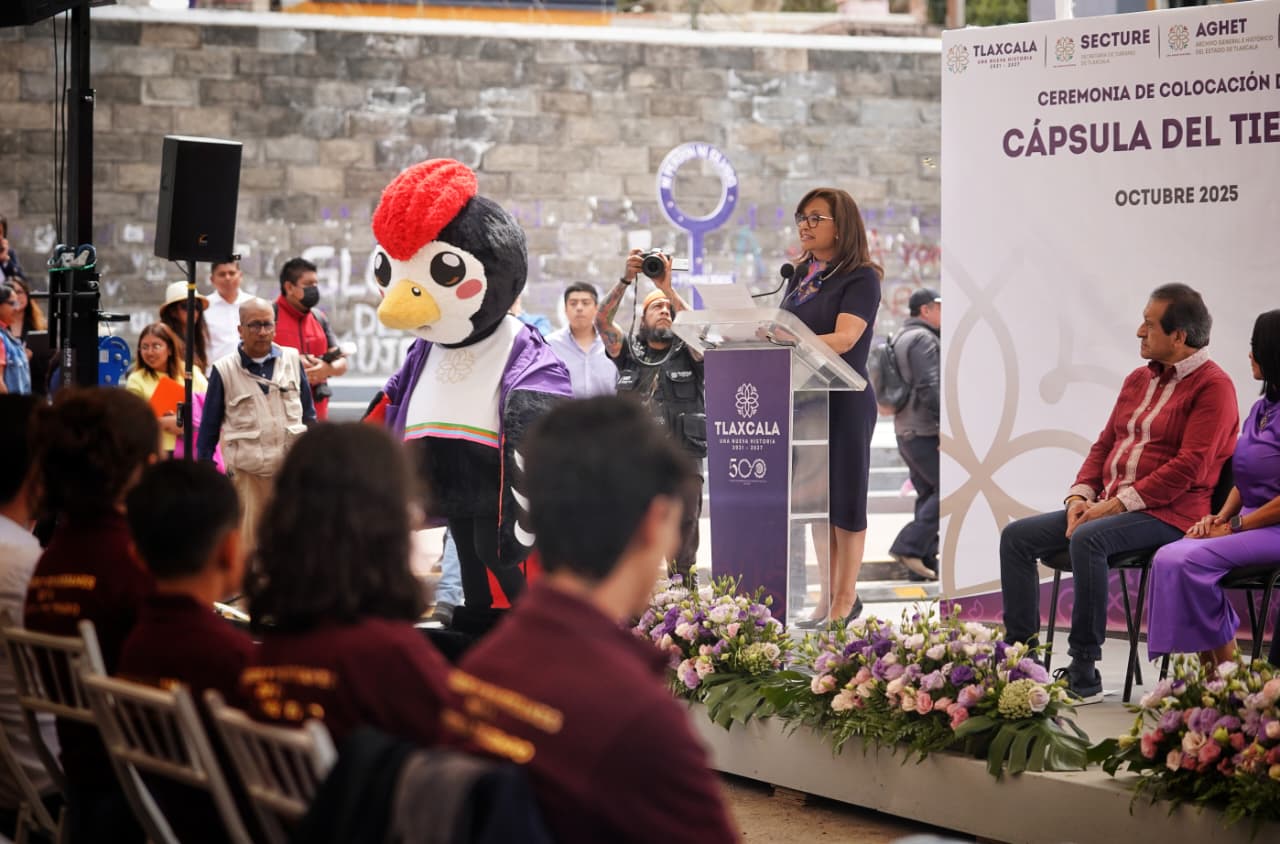 Este martes, la Gobernadora de Tlaxcala, Lorena Cuéllar Cisneros, encabezó la colocación de la cápsula del tiempo que conmemora los 500 años de la fundación de la Ciudad de Tlaxcala, un acto simbólico que busca preservar para las futuras generaciones la esencia de la vida tlaxcalteca en el año 2025.
