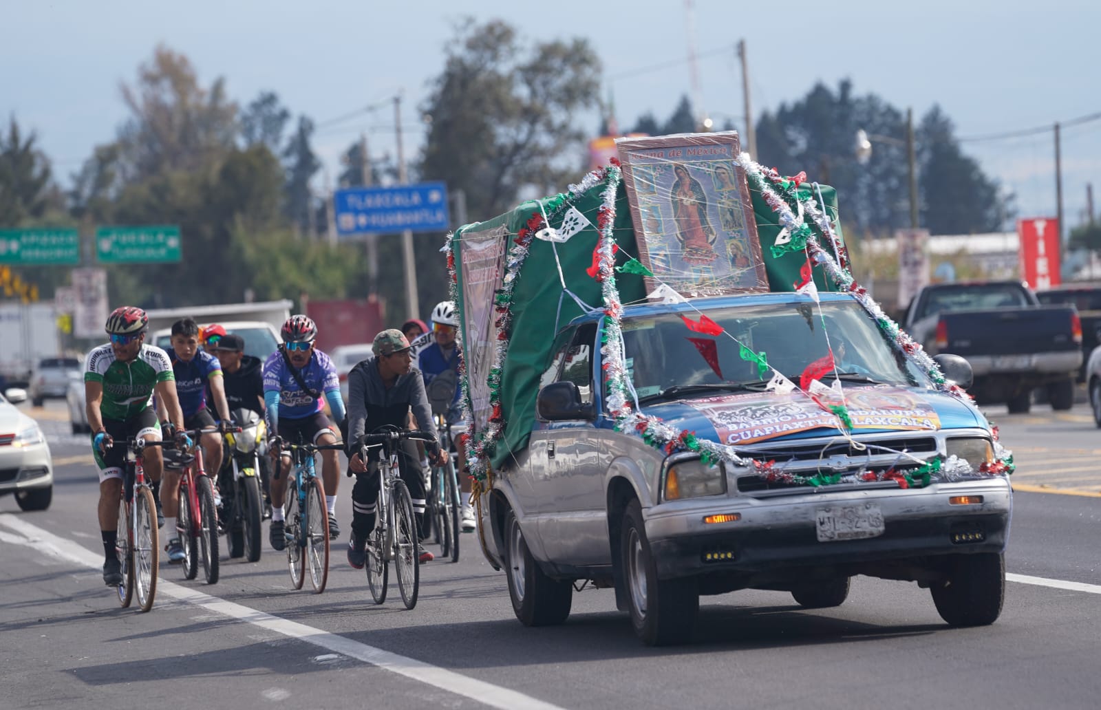 Decenas de peregrinos provenientes de los municipios del oriente de Tlaxcala, así como de estados de Puebla y Veracruz pasan por la carretera federal México-Veracruz a la altura de Yauhquemehcan rumbo a la Basílica de Guadalupe, para visitar a la Virgen del Tepeyac considerada la patrona de México.