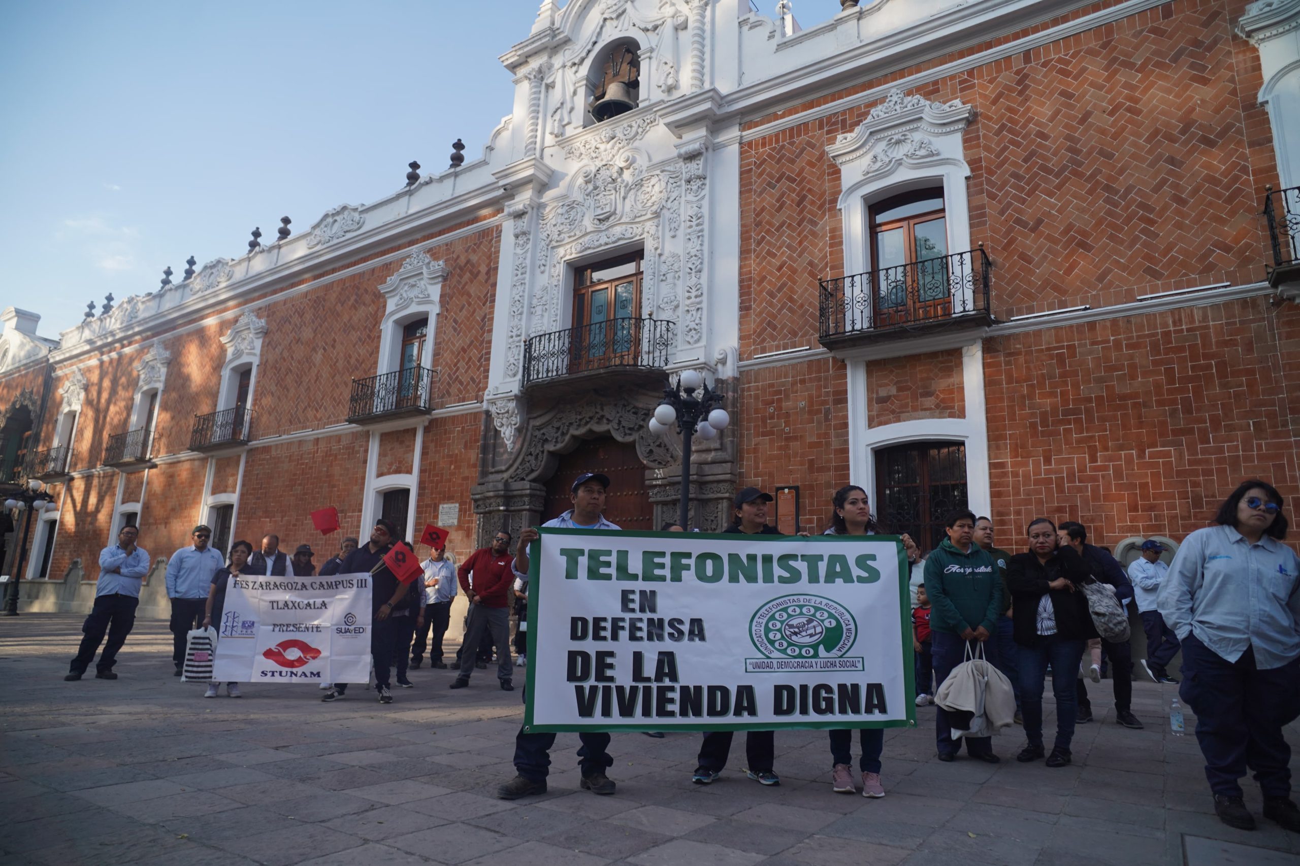 La tarde de este jueves, el Sindicato de Telefonistas de Tlaxcala realizó un pronunciamiento como parte de una Jornada Nacional, con el objetivo de exigir mejores condiciones laborales, entre ellas la reducción de la jornada laboral a 40 horas y un incremento salarial.Al evento acudieron dirigentes de la Confederación Regional Obrera Mexicana (CROM), la Confederación Revolucionaria de Obreros y Campesinos (CROC), la Confederación de Trabajadores de México (CTM) y representantes del Monte de Piedad, en apoyo a sus demandas.
